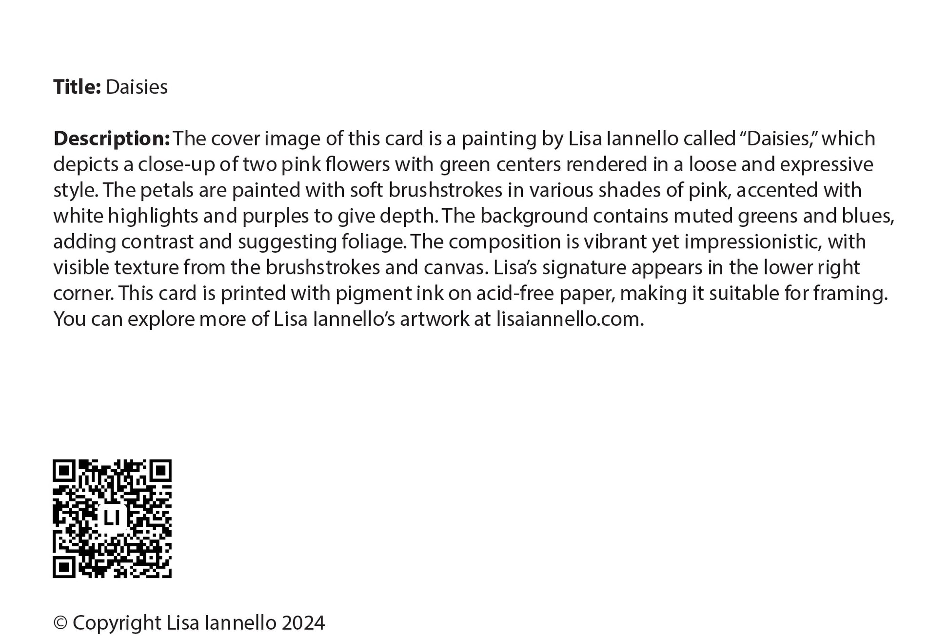 Description: The cover image is a painting by Lisa Iannello, "Birch Trees in Autumn." This vibrant, impressionistic forest scene showcases birch trees with white trunks adorned with dark green markings, characteristic of the species. The back cover contains a detailed description of the image. This card includes an envelope and is suitable for framing.