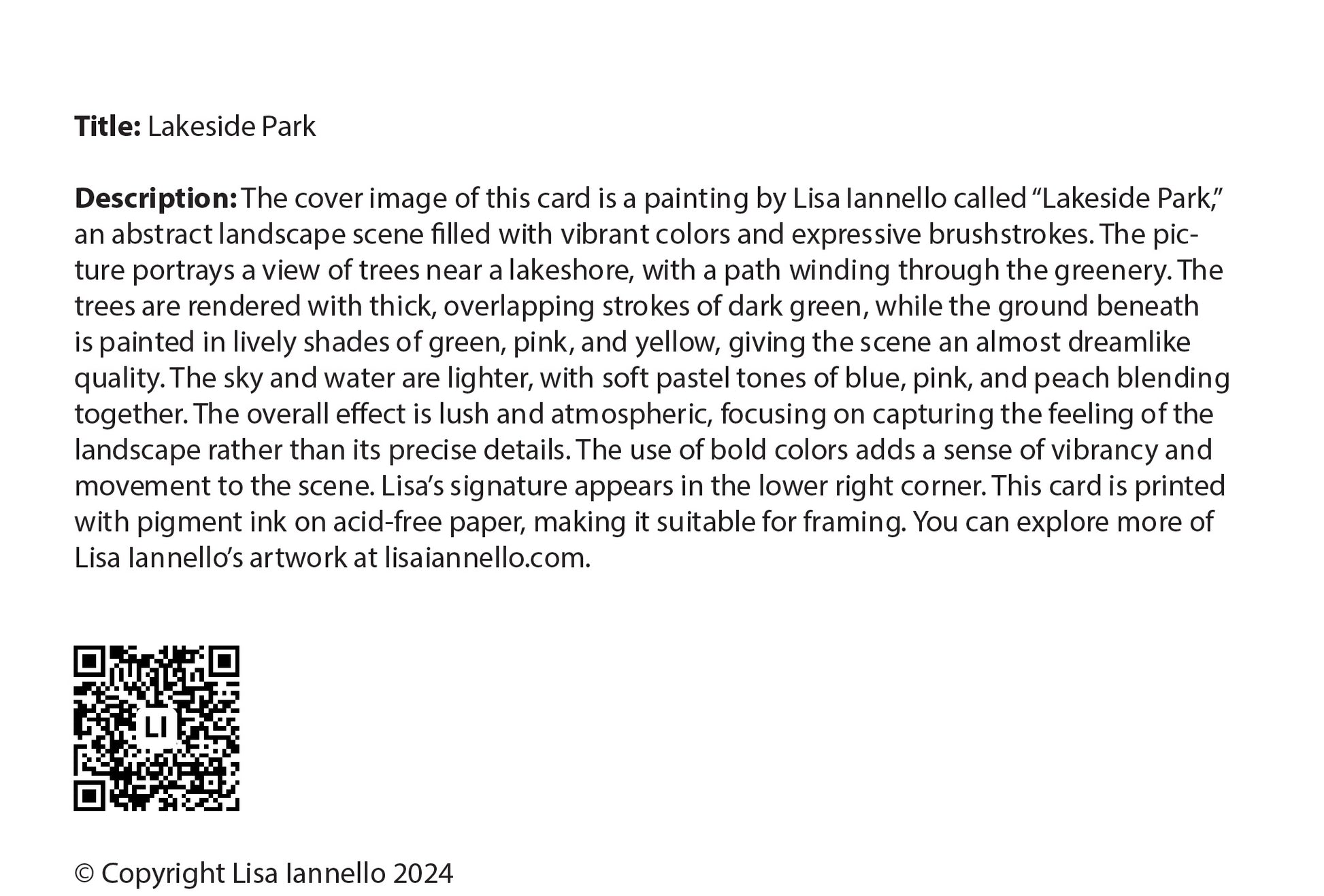 Description: This card's cover image is a painting by Lisa Iannello, "Lakeside Park." It is an abstract landscape scene filled with vibrant colors and expressive brushstrokes. The image portrays a view of trees near a lakeshore, with a path winding through the greenery. The back cover contains a detailed description of the image. This card includes an envelope and is suitable for framing.