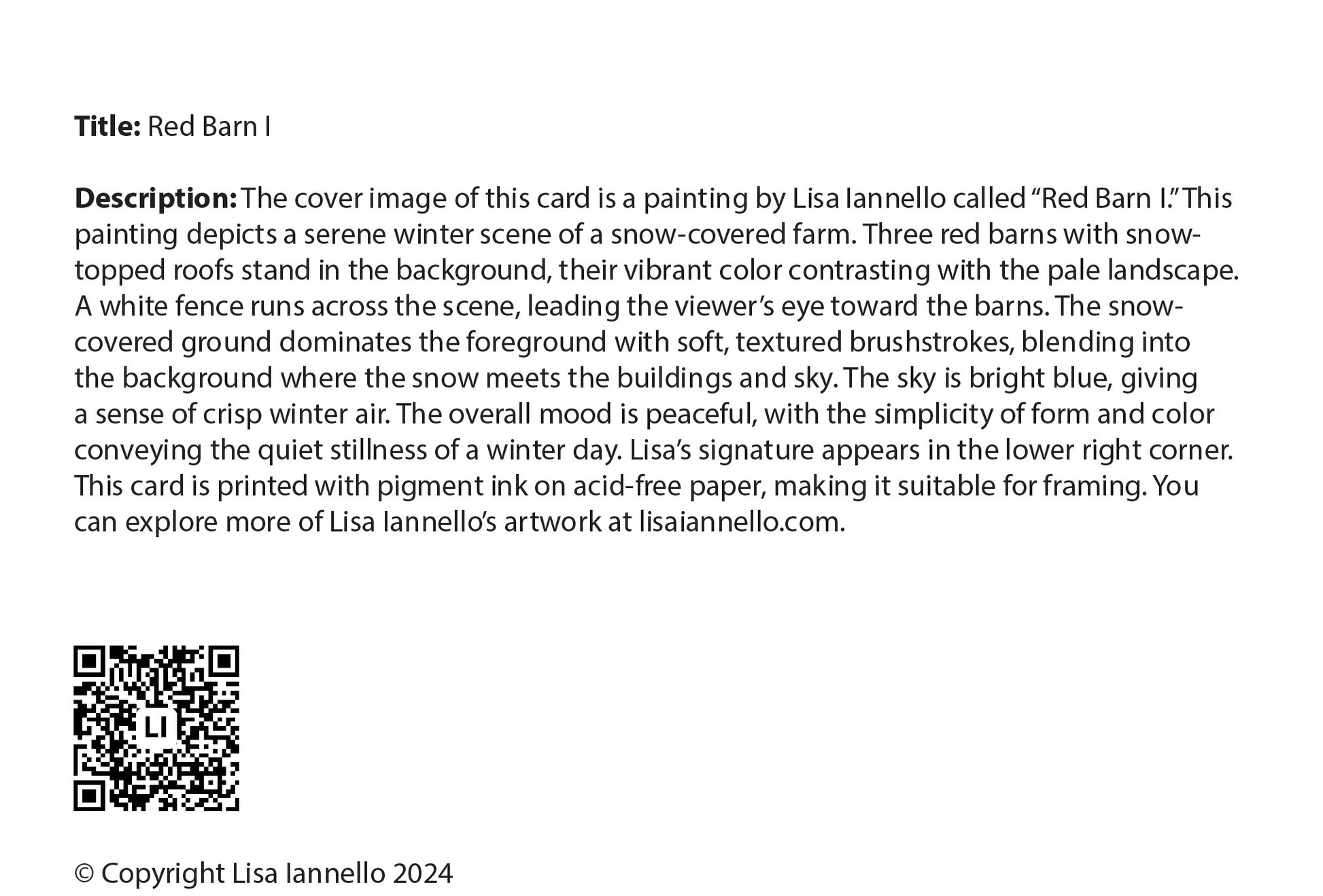 Description: This card's cover image is a painting by Lisa Iannello, "Red Barn I." This painting depicts a serene winter scene of a snow-covered farm. Three red barns with snow-topped roofs stand in the background, their vibrant color contrasting with the pale landscape. A white fence runs across the scene, leading the viewer's eye toward the barns. The back cover contains a detailed description of the image. This card includes an envelope and is suitable for framing.