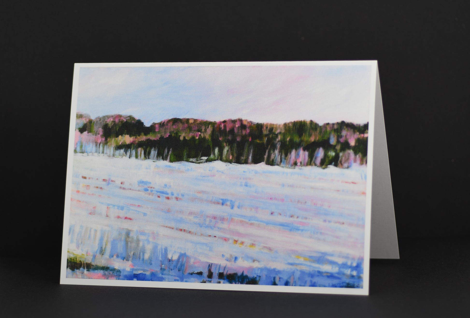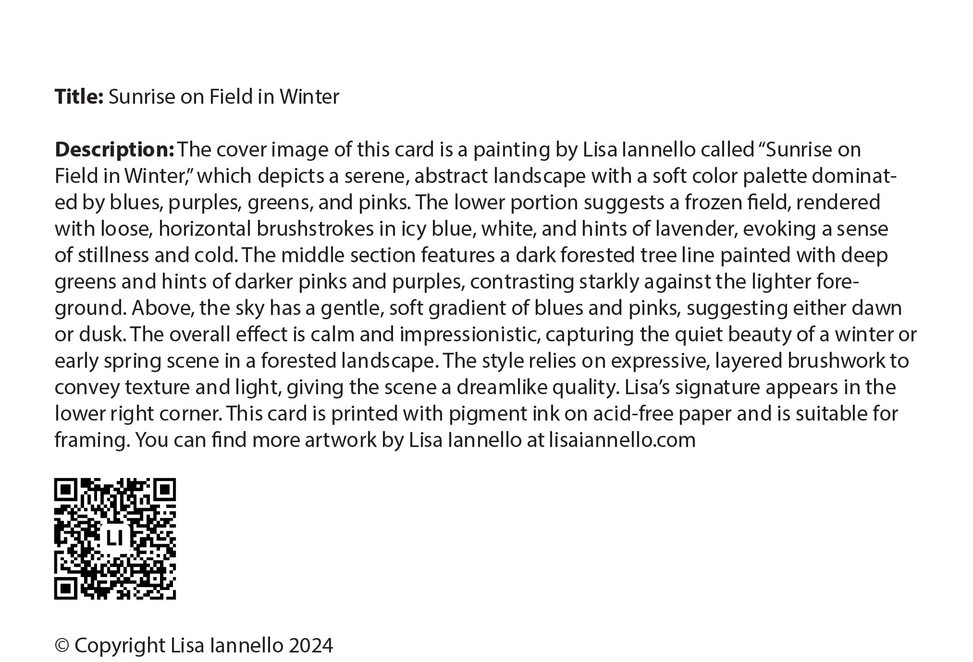 Description: This card's cover image is a painting by Lisa Iannello, "Sunrise on Field in Winter." It depicts a serene, abstract landscape with a soft color palette dominated by blues, purples, greens, and pinks. The back cover contains a detailed description of the image. This card includes an envelope and is suitable for framing.