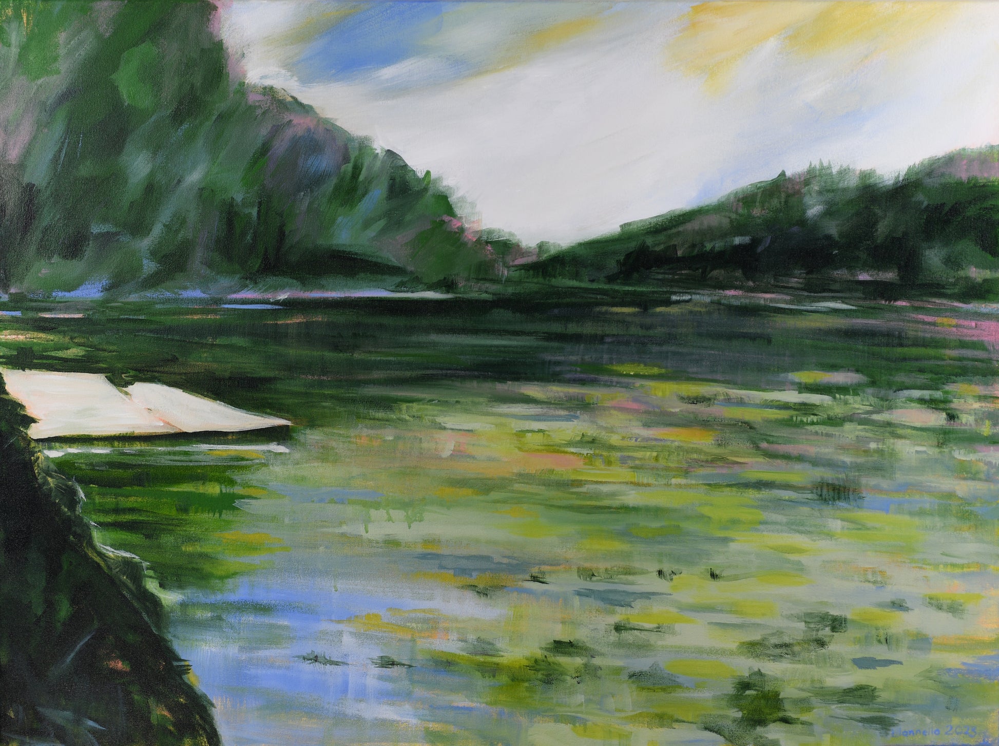 Description: This painting depicts a serene lakeside scene with a strong focus on reflections and natural greenery. The foreground showcases a calm lake surface, painted in layered greens, yellows, and subtle hints of pinks and blues, suggesting reflections of surrounding vegetation and the sky above. On the left, a small white dock extends over the water, adding a human-made element to the otherwise untouched natural setting. The background features densely forested hills painted in dark green tones with soft purple and blue touches, creating depth and shadow. The sky above is bright and expansive, blending white with pale blue and golden yellow hues, evoking a sense of light breaking through clouds or the warmth of early morning. The brushstrokes are loose and expressive, giving the landscape a peaceful, slightly dreamlike quality. The composition invites the viewer into a quiet, contemplative moment in nature. Lisa's signature appears in the lower right corner.